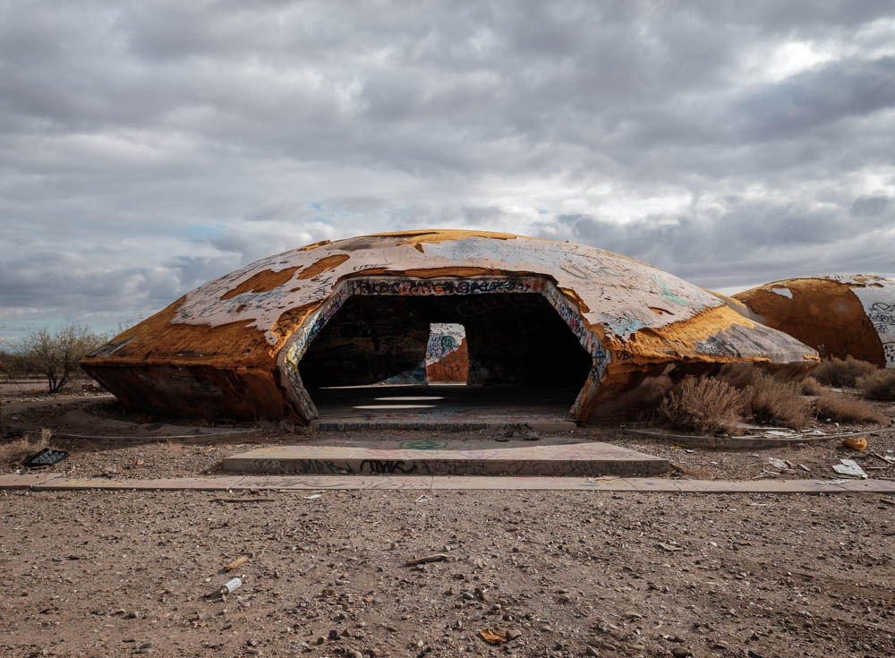 Just as an overview, InnerConn Technology, a circuit board manufacturer from Mountain View, California planned to move their manufacturing facilities 10 miles south of Casa Grande, Arizona. The company created a subsidiary called Dome Industrial & Homebuilders Inc. They planned to build the dome project in three phases, the first was the office, then then manufacturing plant and housing would come next. Unfortunately, they never moved beyond a short-lived office phase. The domes have sit vacant since 1982.